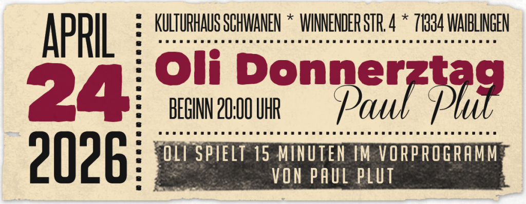 Oli Donnerztag ist ein deutschsprachiger Singer-Songwriter. In seinen Liedern beschreibt er, wie vielschichtig, flüchtig und intensiv ein Leben sein kann. Texte über das Schöne sowie die Schieflage und Geschichten, die zeigen, dass es immer auch noch andere Blickwinkel oder Erzählperspektiven gibt. Seine Akustikgitarre klingt teilweise recht schroff und gibt seinen Texten ein emotionales Fundament. Und dann ist da noch die Tanzmusik …