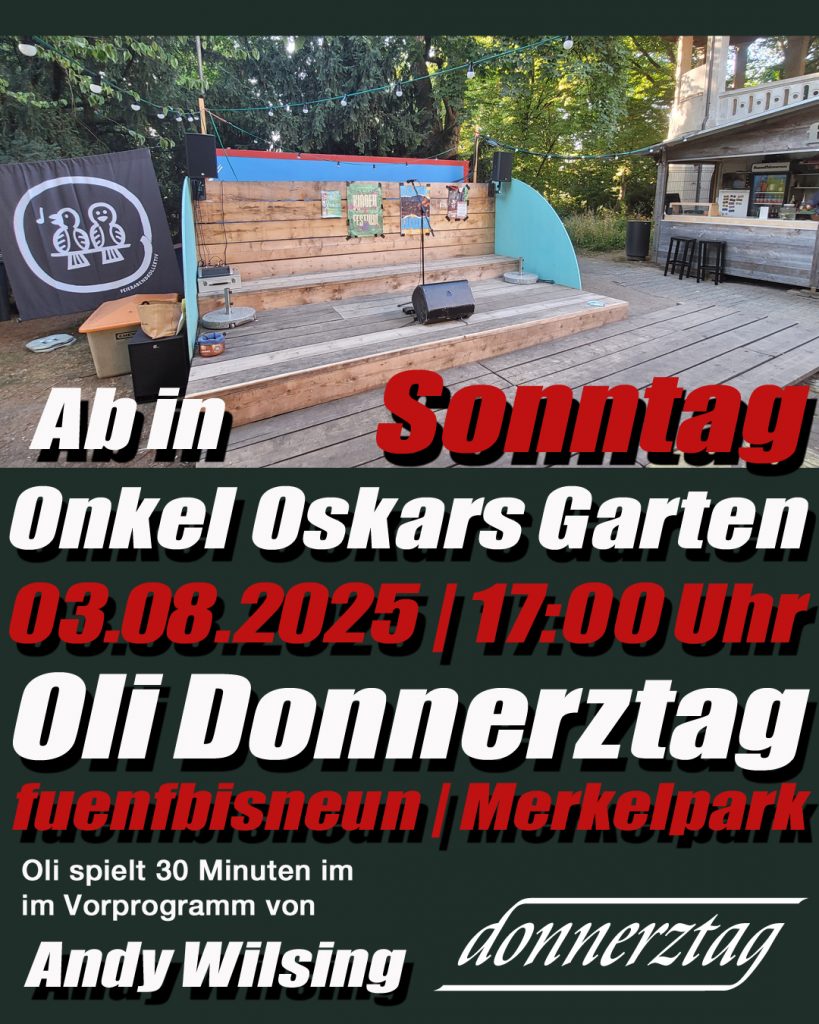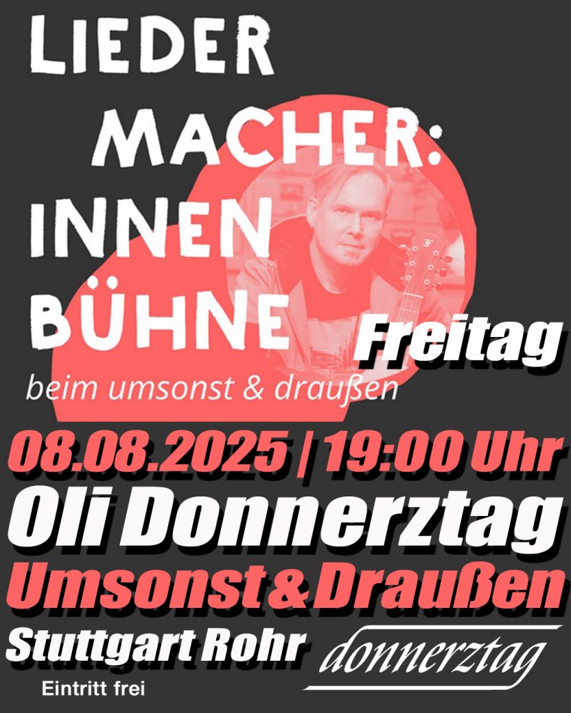Oli Donnerztag ist ein deutschsprachiger Singer-Songwriter. In seinen Liedern beschreibt er, wie vielschichtig, flüchtig und intensiv ein Leben sein kann. Texte über das Schöne sowie die Schieflage und Geschichten, die zeigen, dass es immer auch noch andere Blickwinkel oder Erzählperspektiven gibt. Seine Akustikgitarre klingt teilweise recht schroff und gibt seinen Texten ein emotionales Fundament. Und dann ist da noch die Tanzmusik …